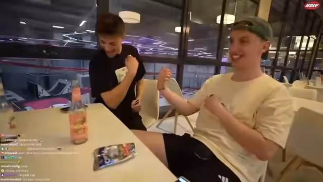 02:43:17Es werden Namen ausgetauscht und über die Angewohnheit gesprochen, das Kinn beim Anziehen von Kleidung zu ziehen. Die Gruppe plant, vor dem Finale noch etwas zu trinken. Es wird kurz über das Aussehen eines anderen Nutzers gescherzt, der Loki ähnelt. Einer der Teilnehmer bemerkt, dass sein Handy nur noch wenig Akku hat. Es wird überlegt, ob man etwas zu essen klauen kann, aber verworfen. Die Gruppe entdeckt eine günstige Essensmöglichkeit und freut sich über die Auswahl an Getränken, darunter Capri-Sonne. Es wird über den ersten Drink seit drei Stunden gescherzt und ein Feierabendbier erwähnt. Die Gruppe sucht einen geeigneten Platz zum Sitzen und bemerkt, dass Eltern oft dort sitzen. Es wird überlegt, ob die Eltern auch Eintritt zahlen müssen. Ein Gruß geht an Papa Platte, und es wird ein Wunsch nach einem neuen Teil des Grassimulators geäußert. Es wird überlegt, ob man seinen Mods etwas kaufen oder sich von ihnen einkleiden lassen soll. Ein Teilnehmer macht etwas kaputt und wird dafür kritisiert. Es wird über die Qualität von Getränken diskutiert und festgestellt, dass sich der Geschmack verändert hat.
