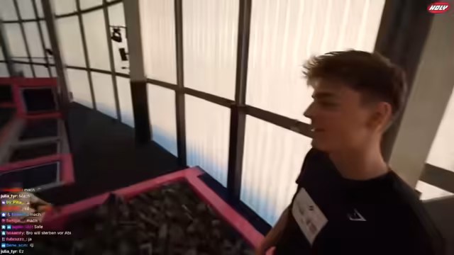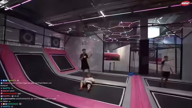 01:24:52Das Team wird von Mitarbeitern des Jump House begrüßt, die bereits über ihre Ankunft informiert sind und den Stream verfolgt haben. Es wird eine Einweisung angekündigt, gefolgt von der Möglichkeit, frei herumzuspringen. Die Mitarbeiter bieten an, bei Fragen jederzeit ansprechbar zu sein und weisen auf spezielle Vorsichtsmaßnahmen beim Filmen hin, insbesondere in Bezug auf Kinder. Getränke werden aufs Haus angeboten. Die Größe und Vielfalt des Jump House werden gelobt, wobei ein Teammitglied es als das bisher krasseste bezeichnet. Es wird vermutet, dass die Fläche etwa 5000 Quadratmeter beträgt. Ein Mitarbeiter wird auf einen möglichen Twitch-Bann hingewiesen. Es wird überlegt, ob es sich bei einem Clip um einen Clip mit N-Bombe handelt. Es wird über die Musiklautstärke gesprochen und darauf geachtet, dass kein Copyright verletzt wird. Es wird die Möglichkeit erwähnt, Wertsachen in Spinde einzuschließen.