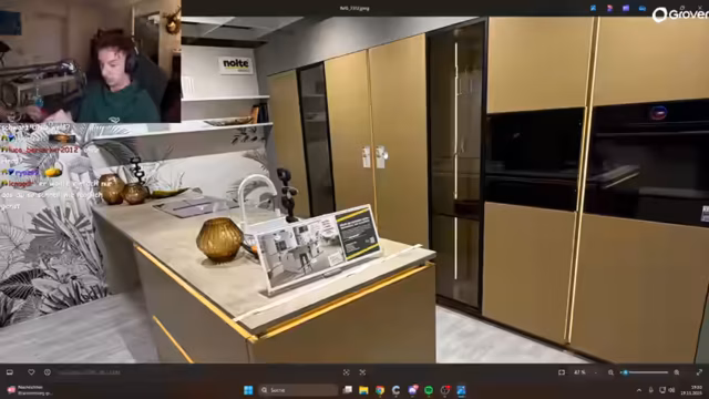 00:16:32Nachdem die Küchenbilder gezeigt wurden, äußert sich der Chat überwiegend negativ zur goldenen Farbe. Der Streamer ist verletzt und sucht aktiv nach Bestätigung, indem er verschiedene Freunde und andere Streamer wie Basti und Heiko nach ihrer Meinung fragt. Es folgt eine ausführliche Diskussion über Ästhetik, Funktionalität und den Wiederverkaufswert einer goldenen Küche. Die Experten raten ihm, bei einer neutraleren Farbe wie Grau oder Weiß zu bleiben und warnen vor den hohen Kosten und einem möglichen späteren Bedauern.