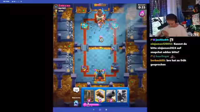 03:27:01Nach Abschluss des Back-Projekts wechseln die beiden zum Gaming-Teil des Streams und spielen Clash Royale. Der Streamer, der das Spiel spielt, wird von seinem Partner gecoacht. Es entstehen hitzige Spiele, in denen der Spieler häufig unter Druck gerät und Fehler macht. Der Coach gibt dabei Taktiken vor, wie man Truppen positionieren und Spiele dominieren kann, doch der Spieler findet es schwierig, die Ratschläge umzusetzen und erlebt mehrere Niederlagen, was zu Frustration und lauten Reaktionen führt.