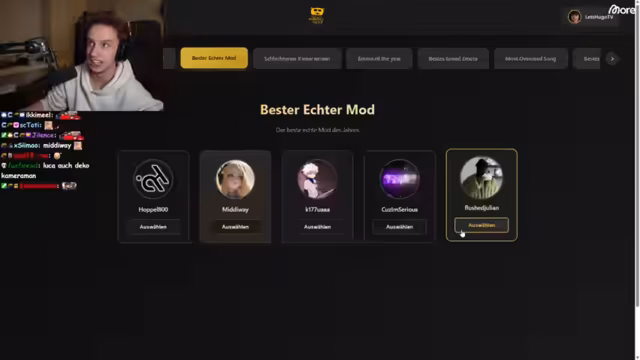 01:15:24Hugo initiiert verschiedene Votings für seine Community. Dazu gehören Awards für den 'schlechtesten Coder', 'bester Mod' und 'bestes Emote des Jahres'. Er lobtMods wie Faki und Luca für ihre Leistungen. Bei den Emotes wird Finking zum Gewählt. Auch werden übernutzte Lieder wie 'I just woke up from a dream' diskutiert und die besten Fortbewegungsmittel wie das Stock-Longboard von Retox präsentiert.