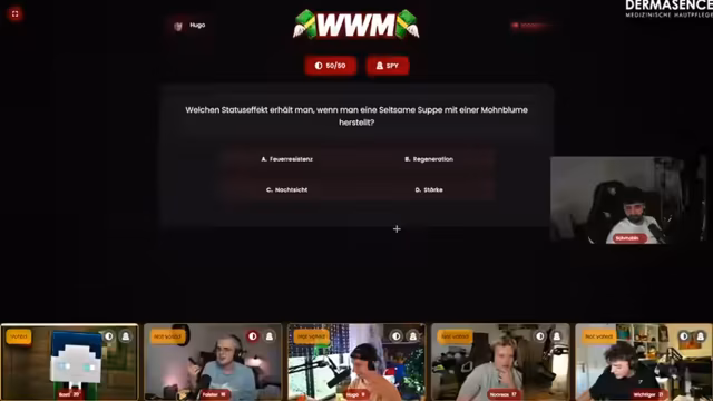 04:19:32Die Fragen wandern zu Themen wie die Effekte von seltsamen Suppen (Mohnblume führt zu Nachtsicht) und die minimale Größe von Biomen (ein Block). Die Teilnehmer nutzen aktiv Joker wie 50-50, um ihre Chancen zu verbessern, während sie gleichzeitig über ihre Spielstrategien und Favoriten diskutieren.