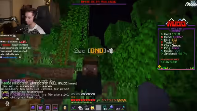 01:57:54Hugo interagiert mit Zuschauern und organisiert spontane Kämpfe, auch um neue Rüstungen zu looten. Er trifft auf einen Spieler namens Hugo, mit dem er einen geilen Fight hat, der aber durch das Eintreffen des Clans BND gestört wird. Hugo sucht den Kontakt zu seinem Team, um eine neue Strategie zu entwickeln, und beendet den Stream mit der Ankündigung, es am nächsten Tag weiterzugehen.