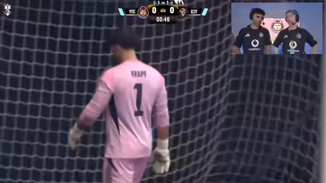 03:36:25Vor dem offiziellen Spiel wird auf dem Spielfeldrand weiter gekickt. Es werden kleine Wetten abgeschlossen, bei denen der Streamer wegen Schmerzen verliert. Gleichzeitig wird der "Pokalfluch" thematisiert, da der gegnerische Kapitán den Pokal angefasst hat. Die Insidereinführung des gegnerischen Teams G2 findet statt und die persönliche Dynamik als Feinde betont.