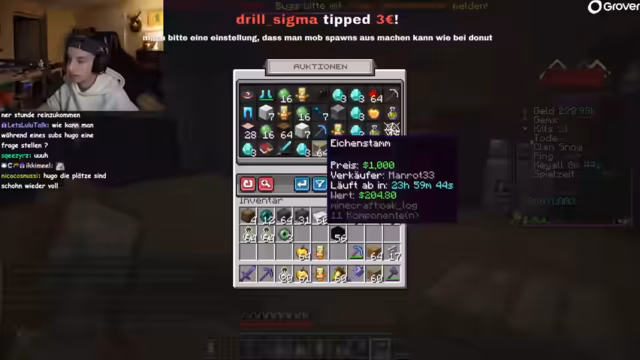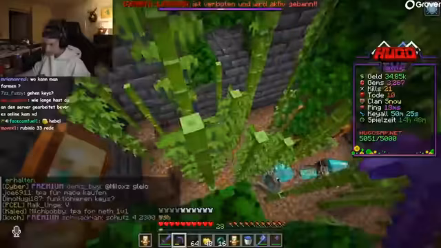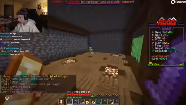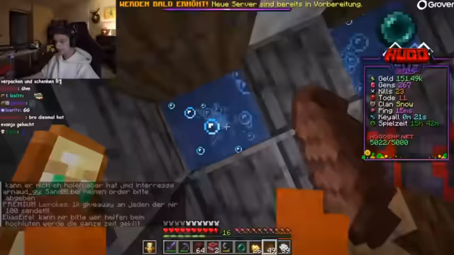 03:25:56Hugo spricht über bevorstehende Server-Updates und erwähnt, dass die Karte vergrößert werden soll. Dies ist eine wichtige Ankündigung, um Platz für zukünftige Aktivitäten wie die geplante Banner-League zu schaffen. Gleichzeitig wird das PvP-Geschehen intensiv. Hugo ist frustriert von ständigen Angriffen durch den 'Apex Clan' und gerät in finanzielle Schwierigkeiten, nachdem er sein Geld verloren hat. Es kommt zu spontanen Duellen, bei denen Hugo seine Fähigkeiten im Kampf testet, wobei er anfangs ungeschickelt wirkt, da er erst kurz auf Hotkeys umgestiegen ist.