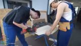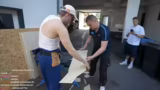 01:54:08Beim Bau der Seitenwände stellt sich heraus, dass die gemessenen Holzplatten nicht lang genug sind. Gleichzeitg kommt es zu einem Unfall mit einem Farbeimer, der umkippt und große Mengen Farbe verstreut. Die Werkstatt wird dabei verschmiert und es wird diskutiert, wie der Schaden behoben werden kann und ob neue Holzplatten besorgt werden müssen.