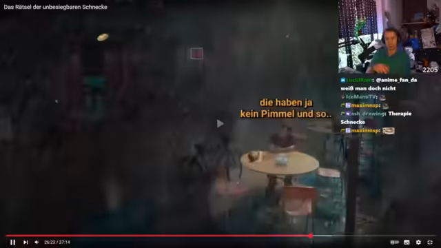 00:45:36Der Streamer widmet sich einem populären Internet-Gedankenexperiment: die unsterbliche, superintelligente Schnecke. Er erläutert die Regeln: Man ist unsterblich, extrem reich, aber wird getötet, sobald eine 6 cm große Schnecke einen berührt. In der Folge werden verschiedene Lösungsansätze und absurde Konsequenzen diskutiert, wie der Kampf gegen einen Kult, der die Schnecke verehrt, oder die Flucht ins All. Die gesamte Diskussion ist sehr philosophisch und humorvoll angelegt.