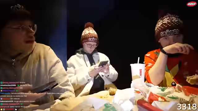 02:40:27Die Unterhaltung der Gruppe ist von spontanen Anekdoten und humorvollen Auseinandersetzungen geprägt. Es gibt ein Wortspiel um den Begriff 'Perzelle' und 'Deutschunterricht'. Ein Teilnehmer berichtet von einem Vorfall im Zusammenhang mit dem Streamer Hugo, bei dem dieser Ketchup getrunken hat, was im Chat für Diskussionen sorgt. Die Gruppe erreicht eine Raststätte, die als sehr dunkel und leise beschrieben wird und bei einigen Teilnehmern ein Gefühl der Unwohlsein hervorruft. Eine Diskussion über Text-to-Speech-Aktivitäten und den Stream-Bot findet statt. Zudem wird eine Kontroverse um ein 'Corona ist fake'-Kommentar erwähnt und im Anschluss daran die Ankunft am Hotel Mr. Beasting angesprochen.