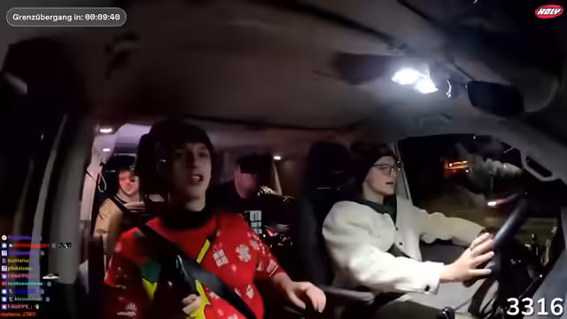 05:07:20Das Team nähert sich der dänischen Grenze, und Annika gibt Anweisungen für den Grenzübergang. Es wird über die Mitnahme von Waffen gescherzt. Kurz vor der Grenze wird die Kurve etwas scharf genommen. Es wird über die Ideallinie auf Landstraßen diskutiert und vor Glätte gewarnt. Hugo hat viel Zucker konsumiert und wird bald einen Zuckerschock erleiden. Es wird über die Cousine eines Freundes gesprochen, auf die jemand steht, und Ratschläge werden ausgetauscht. Dänemark ist nur noch einen Kilometer entfernt. Es wird befürchtet, bei der Zollkontrolle kontrolliert zu werden. Bei der Kontrolle wird das Team jedoch ohne Probleme durchgelassen, obwohl das Fernlicht eingeschaltet war. Nach dem Grenzübergang wird das Roaming aktiviert und festgestellt, dass Starlink für eine stabile Internetverbindung gesorgt hat. Das Team ist nun offiziell in Skandinavien und diskutiert über den Autopiloten des Autos.