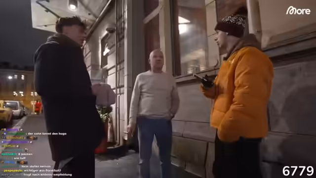 05:43:25Nachdem die Streamer einige Souvenirs und Geschenke gekauft haben, darunter auch eine Schokolade für Hugo, die er für seine Mutter bestimmt, beginnt die Suche nach einem passenden Restaurant für das Abendessen. Hugo äußert den Wunsch nach einem guten Steak und lehnt Pizza ab. Sie finden ein vielversprechendes Restaurant namens "Ravintola Ragu" mit guten Bewertungen, das sehr schick aussieht und nur sechs Minuten zu Fuß entfernt ist. Auf dem Weg dorthin hoffen sie, ein gutes Steak zu bekommen. Während der Navigation kommt es zu humorvollen Diskussionen über die Richtigkeit der Karte und Hugos Orientierungssinn. Sie überlegen auch, ob sie durch eine Abkürzung gehen können. Ein Zuschauer kommentiert, dass Hugo "normal" sei und nicht so dumm, wie er manchmal tue, was Hugo als Kompliment, aber auch als Beleidigung auffasst. Die Suche führt sie weiter zu einem "Manhattan Steakhouse", das aber leider voll ist. Trotz der Enttäuschung suchen sie weiter nach einem Steakhouse, wobei sie auch über ein "Stefans Steakhouse" sprechen.