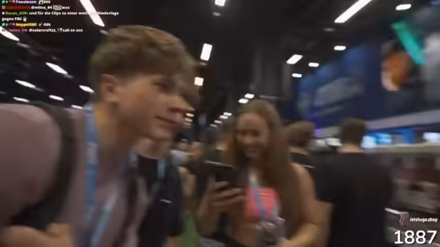 01:46:14Zum Ende des Streams sucht der Streamer nach einem bestimmten Stand und trifft auf alte Bekannte. Er besucht den Stand von Smiley & Paul und interagiert mit Besuchern. Später bittet er darum, dass sein Freund Luca vorbeikommt, damit sie gemeinsam etwas unternehmen können. Der Streamer kündigt an, dass er bald die Messe verlassen muss, da er zu einem bestimmten Zeitpunkt zurück sein muss.