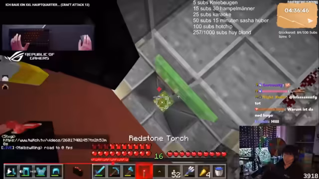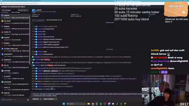 22:54:15Nachdem das Video zu Ende gegangen ist, wechselt der Streamer das Spiel und startet Minecraft, wo er für Zuschauer zur Verfügung steht. Er erläutert seinen Verhältnis zu Arbeit und Schlaf, da er ständig streamt und sich ein Ruhepause als "Arbeitszeitbetrug" vorstellt. Gleichzeitig erwähnt er, dass Hugo sich auf Fischmarkt auf Madeira befindet und einen gesünderen Lebensstil anstrebt. Außerdem beklagt er, dass er in den Chat immer wieder problematische und rassistische Kommentare bekommt, weshalb er相应 bannt.