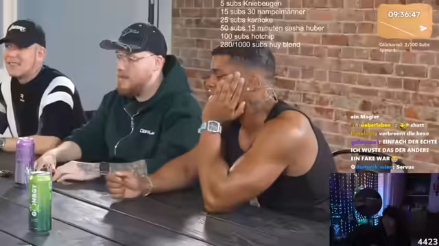 06:00:28Das Team plant die Verteilung der Belohnungen für die Erreichung der 5000-Sub-Marke. Noriax erhält nichts, da er als Fitna angesehen wird. Basti, GHG und Papa Platte erhalten nach einer Wartezeit von einer Woche 500 Subs, um bestimmte Aufgaben zu erledigen. Eine weitere Belohnung von 20 bis 30 Subs wird für das Wegmachen von etwas angeboten, jedoch mit einer Konsequenz von 500 Subs im Nichterfüllungsfall.