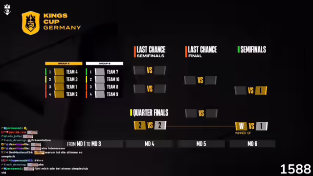 03:14:06Es wird erklärt, dass der Gewinner des Kings Cup nach Berlin kommt, um gegen die Gewinner aus Italien und Spanien zu spielen. Der Weg dorthin wird erläutert: Acht Teams kämpfen in zwei Gruppen, die Gruppensieger ziehen direkt ins Halbfinale ein, die Zweitplatzierten spielen im Viertelfinale, und für die Verlierer gibt es eine letzte Chance über das Playoff. Das Finale findet am 22. November in Berlin statt. Kevin erwähnt, dass er in Barcelona mit Gerard über den Austragungsort gesprochen und Berlin vorgeschlagen hat. Es soll auch ein Streamer-Match geben, bei dem die Presidents gegeneinander antreten. Kevin wird Captain sein und würde gerne Hugo und Ebro in sein Team holen.