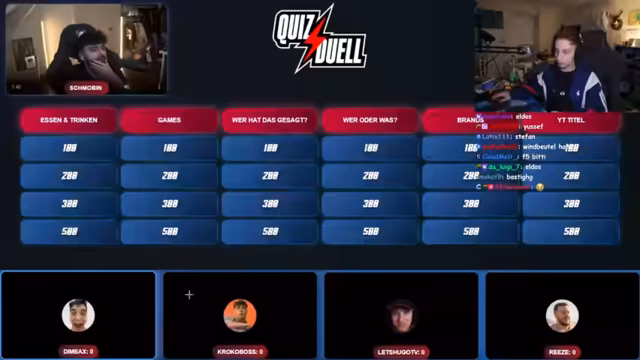02:56:42Das Quizduell beginnt mit verschiedenen Kategorien wie Wer oder Was, Games, YouTube-Titel, Essen und Trinken und vielen anderen. Die Spieler wählen Kategorien aus und beantworten Fragen mit unterschiedlichen Schwierigkeitsstufen und Punktewerten. Es kommt zu Diskussionen über richtige Antworten, bei denen teilweise differente Meinungen und Erklärungen ausgetauscht werden. Die Teilnehmer haben die Möglichkeit, mit einem Buzzer zu signalisieren, wenn sie eine Frage beantworten möchten.
