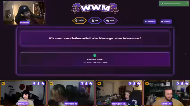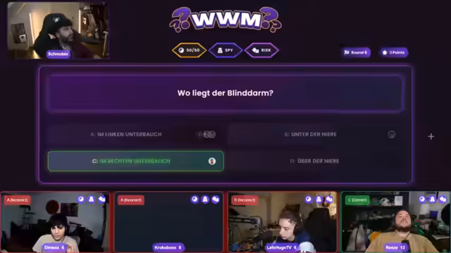 03:45:50Das Spiel-Format WWM wird fortgesetzt mit einer Reihe von Fragen aus verschiedenen Wissensgebieten. Die Teilnehmer müssen sich zwischen vier Antwortmöglichkeiten entscheiden. Es werden Fragen zur Anatomie, Chemie, Film und mehr gestellt. Die Spieler diskutieren die Antworten und es kommt zu humorvollen Kommentaren und Reaktionen. Einige Fragen führen zu längeren Diskussionen, während andere schnell gelöst werden.