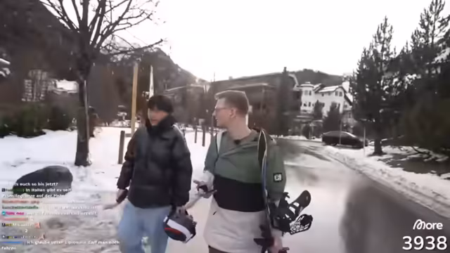 00:30:16Die Gruppe fährt gemeinsam weiter, verliert sich jedoch im Waldgebiet. Technische Probleme dominieren: Internetverbindung bricht ständig zusammen ("Internet ist Müll"), 5G-Router funktionieren nicht. Es gibt einen Zusammenstoß zwischen Snowboardern, bei dem eine JBL-Box verloren geht. Später wird die Box glücklicherweise wiedergefunden.