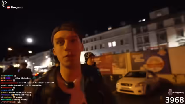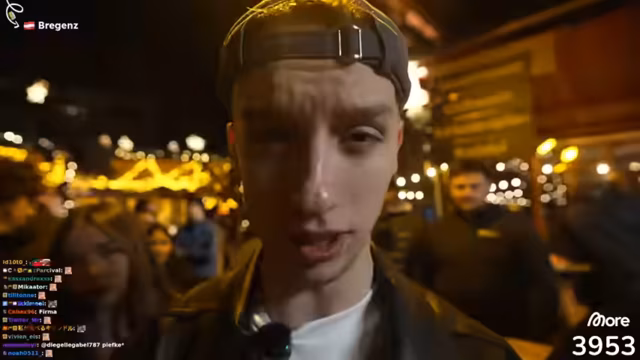 03:13:44Die Gruppe macht in Bürs, einer Stadt in der Nähe von Bregenz, eine Versorgungspause. Es wird nach einem Parkplatz gesucht, der sich unerwartet schnell findet. Streamer Felix übernimmt das Fahren, was für die Gruppe eine Erleichterung ist. Gleichzeitig wird die Suche nach dem gesuchten Spannungswalker fortgesetzt und im Gespräch werden die Begriffe „Kirchweih“ und „Volksfest“ diskutiert.