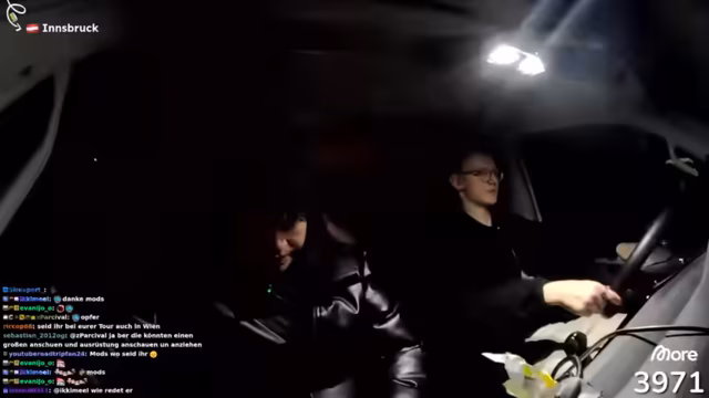10:26:15Die Vorbereitungen für die bevorstehende, zweistündige Nachtfahrt nach Innsbruck laufen auf Hochtouren. Die Fahrzeuge werden kontrolliert und das Licht eingeschaltet. Die Teilnehmer machen sich bereit für die Fahrt, während der Stream sich langsam dem Ende neigt und eine letzte Verabschiedung von der Community erfolgt.