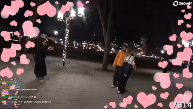 03:25:24Die Streamer versuchen, ein gemeinsames Foto zu machen, was sich jedoch als schwierig erweist, da die Kamera-Einstellungen angepasst werden müssen. Nach einigen Versuchen gelingt es ihnen schließlich, ein gutes Bild aufzunehmen. Die Zuschauer im Chat kommentieren die Situation humorvoll. Anschließend machen sich die Streamer auf den Weg zum Restaurant. Der Weg dorthin dauert etwa 15 Minuten zu Fuß. Während des Spaziergangs kommt es zu weiteren lustigen Interaktionen und Gesprächen. Sie entdecken eine Tierfigur, auf der man sitzen kann, und machen daraus einen weiteren humorvollen Moment. Die Finger sind kalt, aber die gute Stimmung bleibt erhalten.