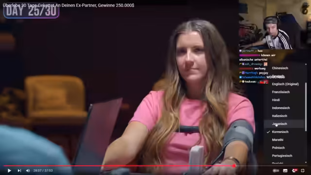 00:31:31Der Streamer analysiert das MrBeast-Format 'Couple's 30 Day Challenge' intensiv. Er zeigt sich begeistert von der radikalen Maßnahme, die Kette der beiden Protagonisten nach 24 Stunden zu halbieren, und kommentiert die daraus resultierenden Konflikte. Insbesondere die anfängliche Entfernung zwischen Josh und Susie und das Beziehungsdrama, das sich daraus entwickelt, wird live kommentiert und als extrem 'geisteskrank' eingestuft.