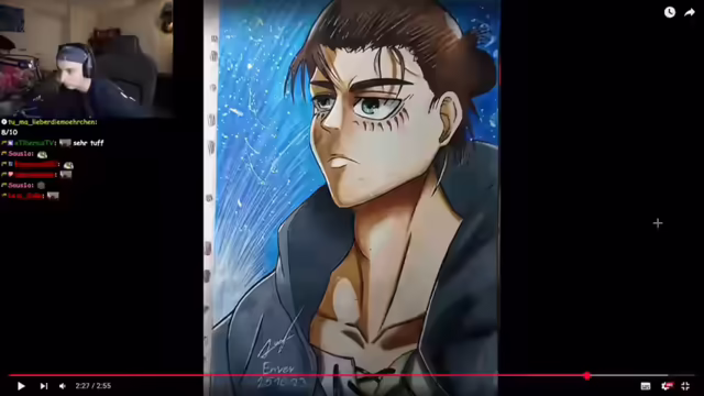 03:51:36Enver Özkan, 18 Jahre alt, präsentiert sein Talent im Zeichnen. Er zeigt verschiedene seiner Werke, beginnend mit älteren Zeichnungen aus seiner frühen Schaffensphase vor vier Jahren, wobei er selbstkritisch auf technische Mängel wie ungerade Linien und mangelhafte Kolorierung hinweist. Er präsentiert eine neuere Arbeit, an der er etwa eineinhalb Jahre gearbeitet hat, und entschuldigt sich scherzhaft für seine übergewichtige Katze im Bild. Trotz anfänglicher Selbstkritik erhält Enver positive Rückmeldungen für seine Fortschritte und die Qualität seiner neueren Werke. Abschließend werden weitere Zeichnungen gezeigt, darunter Fanarts von Robin und Nami aus One Piece, die mit 8 von 10 Punkten bewertet werden. Insgesamt wird Envers Talent und sein Fortschritt positiv hervorgehoben.