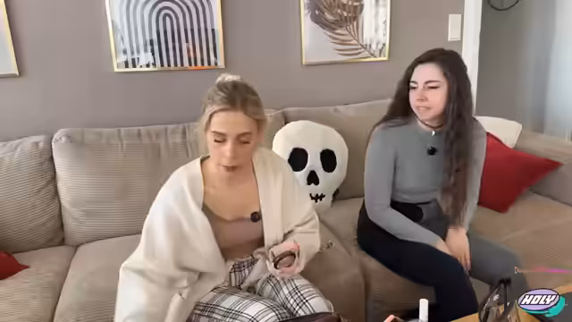 01:52:02Die Streamerin und ihre Freundin Sonja packen Taschen für den Ausflug zur Kürbisfarm. Sie entscheiden über passende Kleidung, darunter Jacken, und übernehmen Snacks und Getränke in einen Korb. Während der Vorbereitungen unterhalten sie sich über Themen wie Tattoos, Essensvorlieben und das Verhalten ihres Hundes, der ständig Beine ableckt. Die Anspannung vor dem gemeinsamen Event ist spürbar.