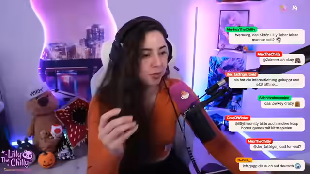 03:02:57Die Streamerin beschreibt ihre eigene Schreckhaftigkeit und ihren Genuss, wenn andere mehr Angst haben. Sie äußert sich zu Sprachpräferenzen in Spielen und Medien: Anime und Spiele wie Little Nightmares spiele sie generell auf Deutsch, da sie den Humor oft besser rüberkomme finde. Ausnahme sei Call of Strike, da die deutschen Sprachlinien ihr als cringe erscheinen im Gegensatz zur englischen Version.