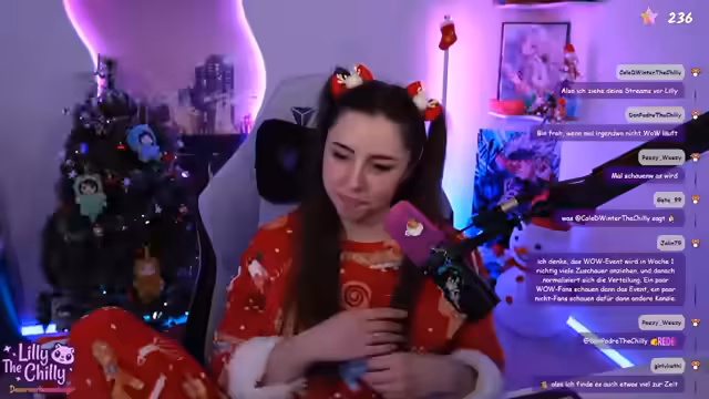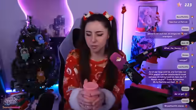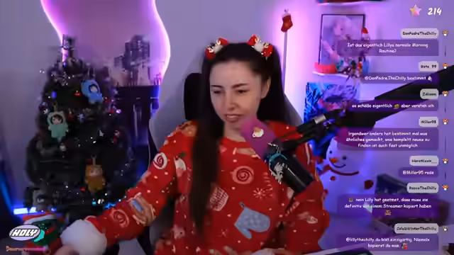 01:54:37Lilly startet ein Giveaway für Koala-Cola von Holy und erklärt ihre Kooperation mit dem Unternehmen. Obwohl sie Cola-Geschmack nicht mag, schätzt sie die Produkte und gibt 15% Rabatt (statt ursprünglich 10%). Sie erwähnt, dass Partnerschaften es ihr ermöglichen, künftig mehr Inhalte ohne Abhängigkeit von Subs zu bieten. Später verlost sie ein Weihnachtspaket mit Holy Winterpunch, Kerzen und Pokémon-Artikeln, wobei Teilnahme nur für Follower möglich ist.