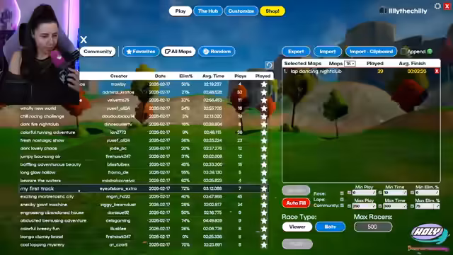 01:18:08Der Stream wechselt zu einem Community-Spiel namens Marbles, bei dem mehrere Teilnehmer mit Murmeln durch verschiedene Maps navigieren müssen. Die Streamerin stellt die ausgewählten Maps vor, darunter Minions Twisty Castle, Clever Crazy Confusion, Marvellous Mellow Match, Amusing Fantastical Fun und Under the Sea. Während des Spiels kommentiert sie das Geschehen humorvoll, kritisiert die Map Partypulses Minions Twisty Castle als nicht empfehlenswert und berichtet über die Positionen und Zwischenfälle der Spieler, inklusive technischer Probleme wie hängengebliebene Murmeln und unfaire Platzierungen aufgrund der Zählung der gespielten Runden.