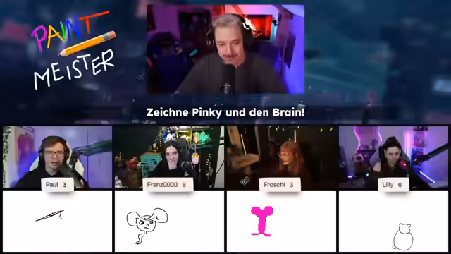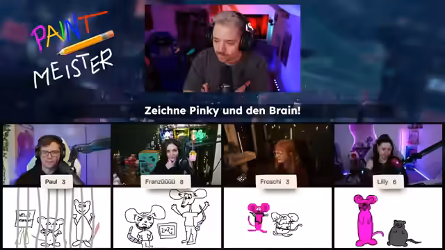 05:36:19Der Stream beginnt mit einer kreativen Aktion, bei der Lilly gemeinsam mit der Community die Charaktere Pinky und The Brain aus Zeichnungen nachstellt. Die Teilnehmer versuchen, die Figuren so genau wie möglich zu zeichnen, wobei Lilly die Community-Kreationen live bewertet und kommentiert. Es werden humorvolle Vergleiche angestellt, wie etwa die Beschreibung von Pinkys durchtrainiertem Körper und seiner Blockflöte als Nase. Das Voting zeigt, dass Paul und Franzi besonders nah an den Originalen sind, was zu einem spannenden und unterhaltsamen Wettkampf führt.