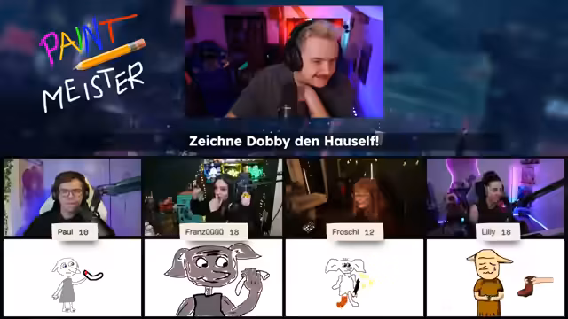 06:05:22Als Höhepunkt des Streams startet das 'Grand Finale' mit dem Thema 'Dobby der Hauself' aus Harry Potter. Lilly regt an, Dobby zu zeichnen, und die Community reagiert mit einer Flut an kreativen und 'cursed' Bildern. Dabei wird über Dobbys Aussehen und Charakter diskutiert, insbesondere seine Ohren und seine Socke. Das Voting ist äußerst knapp und spannend, wobei Froschi am Ende mit einem 'perversen' Dobby-Bild knapp gewinnt. Das Spiel rundet den interaktiven und kreativen Höhepunkt des Streams ab.