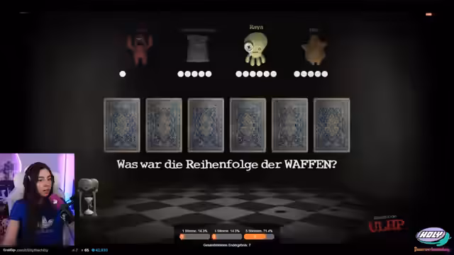 01:29:45Es wird eine neue Szene eingeleitet und eine weitere Runde Jackbox Games gestartet, wobei der Fokus auf Vertrauen innerhalb der Gruppe liegt, insbesondere in Bezug auf vergangene Verrate. Der neue Raumcode wird geteilt, und es gibt humorvolle Diskussionen darüber, wie man in der Grundschule das Alphabet 'schissen' hat. Die Gruppe philosophiert über den schwierigsten Buchstaben zum 'kacken' und tauscht sich über persönliche Vorlieben aus. Es folgt eine Fragerunde, in der es um den Frontmann Johannes Strate geht, und die Spieler werden mit Gift versehen, was zu strategischen Entscheidungen führt. Es wird überlegt, wer aus den vergifteten Getränken trinken würde, und es kommt zu unerwarteten Todesfällen. Die Fragen werden immer abstruser, von Philosophenzitaten bis hin zu persönlichen Vorlieben wie Roséwein. Die Gruppe diskutiert über die Antworten und versucht, die richtige Wahl zu treffen, während sie gleichzeitig mit den Konsequenzen ihrer Entscheidungen konfrontiert werden. Die Runde ist geprägt von Humor, Überraschungen und persönlichen Enthüllungen, während die Teilnehmer versuchen, die kniffligen Fragen zu meistern und die anderen auszuspielen.