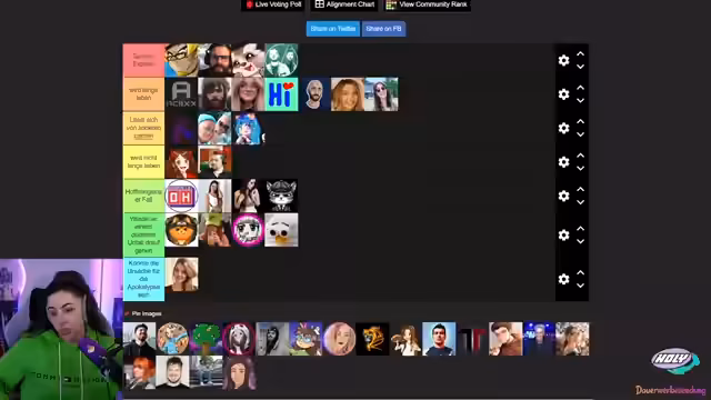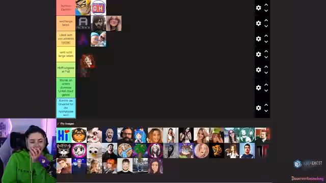 04:32:46Nach einer kleinen Pause, die eine anstehende Apokalypse vorgibt, kündigt die Streamerin eine Tierlist mit den Streamern an. Das Thema ist, wer in einer Zombie-Apokalypse als 'Survivor-Experte' überleben würde. Dazu werden verschiedene Kategorien wie 'wird lange leben', 'wird nicht lange leben' oder 'lässt sich von anderen carryn' besprochen und im Stream zusammengestellt. Es geht um die Bewertung der Streamer-Persona und nicht um deren Privatleben.
