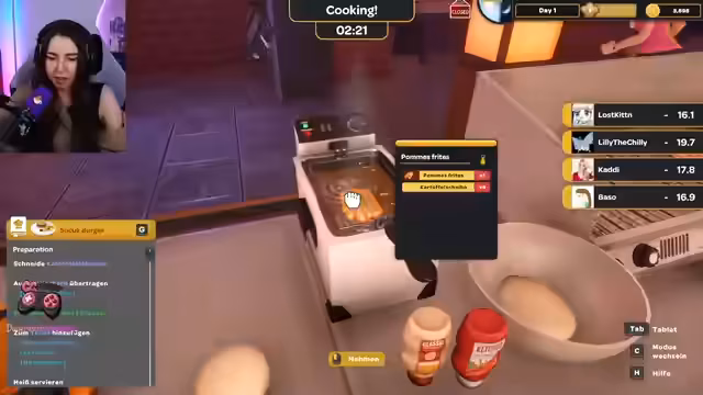 04:11:30Es wird bemerkt, dass Messer gestohlen wurden, und eine Person wird beschuldigt. Es wird diskutiert, ob man eine Kuchenmischung verwenden darf oder den Kuchen selbst backen muss. Eine Person gibt zu, die ganze Zeit sabotiert zu haben. Es gibt Probleme, den Spieß abzulösen, und die Pommes werden raunend. Es wird gefragt, wo man drücken muss, um den Fleischwolf zu benutzen. Jemand fragt, ob man einfach rohen Knoblauch und Chili verwenden soll. Es wird gefragt, wo man Eier braten kann. Es gibt Probleme, die Zutaten in die Pfanne zu bekommen. Es wird festgestellt, dass eine Pfanne kaputt ist. Es wird der Wunsch geäußert, Kebab zu spielen, anstatt Burger zu machen. Es gibt Schwierigkeiten, Burgerbrötchen aufzuschneiden. Es wird gefragt, ob die Fritteuse richtig benutzt wird und ob die Kartoffeln durch sind. Es wird gehofft, dass die Bewertung nicht wieder übersprungen wird. Es wird festgestellt, dass der Backofen die ganze Zeit läuft, obwohl nichts drin ist. Es gibt Verwirrung darüber, was auf den Teller gehört. Eine Person gibt zu, beim Kochen gestresst zu sein.