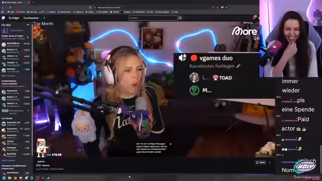 00:19:26Die Streamerin erinnert sich an den 'Back to 2019' Stream von Sonja (Milchbaum), der sehr 'awkward' gewesen sei. Sonja hatte in diesem Stream ihren früheren Vibe wieder aufleben lassen, bei dem sie Hater in ihren Discord einlud, um mit ihnen zu sprechen und sie zu 'beleidigen'. Die Streamerin gibt humorvoll zu, dass sie selbst im Discord war und ihre Stimme verstellt hatte, um nicht erkannt zu werden. Es wird spekuliert, ob es Clips davon gibt, und die Streamerin findet schnell einen Clip von 'Milchbaum'. Es folgt eine humorvolle Interaktion mit einem Zuschauer namens Puff, dessen rauchige Stimme als die eines 'alten Opas' beschrieben wird. Die Streamerin scherzt über peinliches Verhalten und fordert Puff auf, sich bei 'Mama' zu bedanken. Sie fragt sich, was man heutzutage noch sagen oder tun darf, wenn nicht einmal mehr 'Bubis anfassen' erlaubt ist. Ein Zuschauer versucht, die Streamerin nicht mehr für ihren 'Pilz-Toad', sondern für ihren 'Muschi-Pilz' bekannt zu machen, was die Streamerin humorvoll ablehnt und auf eine vergangene Urlaubsgeschichte mit Sonja anspielt, die ihr immer noch vorgehalten wird.