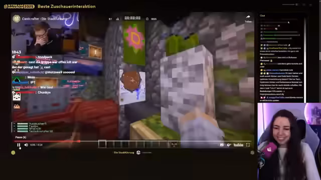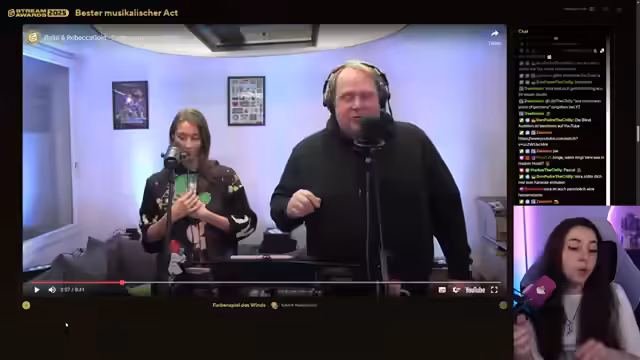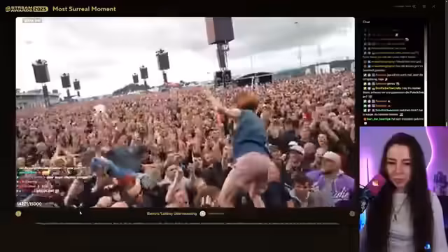 02:33:48Nachdem die technischen Schwierigkeiten behoben waren, widmete sich die Streamerin den "Most Surreal Moments" der Stream Awards. Sie reagierte auf einen Clip, der ein Jahr Zusammenarbeit mit einem Zuschauer feierte und als "unfassbar schön" beschrieben wurde, da er einen Traum von Polarlichtern im Stream festhielt. Ein weiterer Clip zeigte einen Zaubertrick mit einer fallenden Karte, dessen Funktionsweise die Streamerin nicht nachvollziehen konnte und die Community um Aufklärung bat. Ein dritter Clip zeigte eine ungewöhnliche Art, zur Arbeit zu kommen, bei der die neblige Wetterlage bedauert wurde, da sie die Aussicht trübte. Besonders beeindruckt war sie von einem Clip, der HandOfBlood bei einem Live-Auftritt mit Electric Callboys zeigte, wobei sie jedoch ihre Stimme für andere Clips abgab, um auch kleineren Streamern eine Chance zu geben.