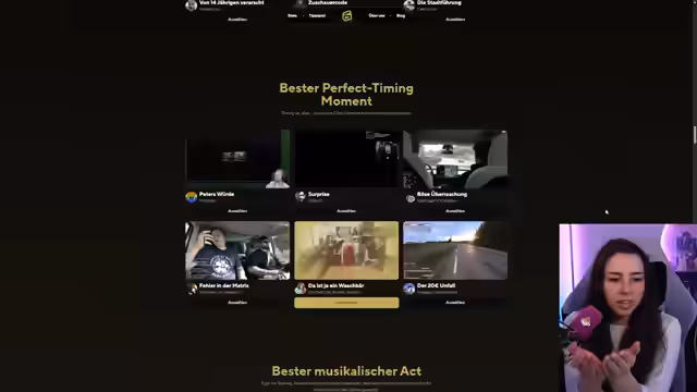 01:33:35Die Streamerin leitet zur Kategorie 'Bester Timing-Moment' über und betont die Bedeutung dieser Kategorie, insbesondere da ihr eigener Clip hier nominiert ist. Sie erkennt an, dass es auch andere starke Clips gibt, hebt aber hervor, dass ihr Clip und der von Kati und Leon in dieser Kategorie ihre einzigen Nominierungen sind, was den Wunsch nach einem Sieg verstärkt. Ein Clip, der einen Blitzer zeigt, wird kritisiert, da er illegales Verhalten (zu schnelles Fahren und die Nutzung einer Blitzer-App) darstellt und die Streamerin dies nicht als 'witzig' oder 'cool' für die Stream Awards empfindet. Sie äußert ihr Unverständnis darüber, wie solche Inhalte in die Awards gelangen können. Ein weiterer Clip zeigt eine Person, die 20 Euro in einem Graben findet, was als verrücktes Timing gefeiert wird. Die Streamerin findet diesen Clip, abgesehen von dem Blitzer-Clip, sehr stark und lobt die Vielfalt der anderen Beiträge in dieser Kategorie. Trotz der starken Konkurrenz bleibt sie dankbar für die Einladung zu den Stream Awards und die Nominierung ihres Clips, auch wenn ihre Hoffnung auf einen Sieg schwindet. Sie betont, dass ein Gewinn die 'Kirsche auf der Torte' wäre und sie sich sehr darüber freuen würde, auch wenn sie die Schwierigkeit des Wettbewerbs und mögliche Faktoren wie die Reichweite der Streamer anerkennt.