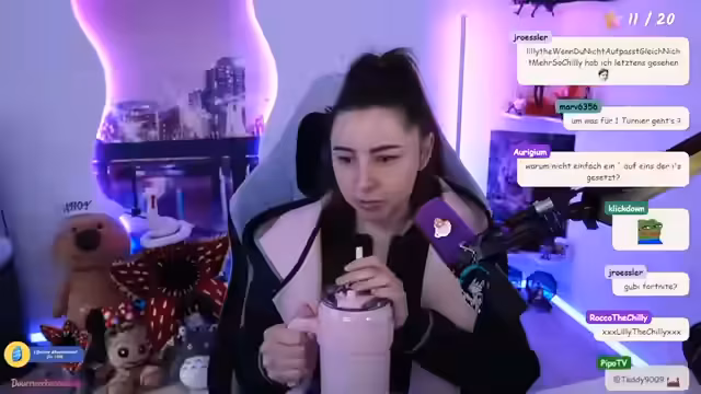 00:19:09Die Streamerin spricht über ihre Teilnahme am Fortnite-Turnier und drückt ihre Vorfreude aus, auch das Spiel zuzuschauen. Sie kündigt für den nächsten Tag einen Sprachkurs und ein Valorant-Spiel mit einer Girls Lobby an. Zudem informiert sie über ein Community-Treffen in Frankfurt am 24. Mai in einem Brettspielcafé, zu dem sie alle interessierten Zuschauer einlädt. Sie erklärt, warum sie nur einer Person Administratorrechte in ihrem Discord-Forum gegeben hat und zeigt ihre Wertschätzung für ihre Supporters.