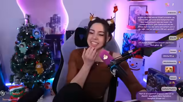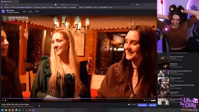 02:03:18Lilly beginnt die Reaktion auf ein Vollcontent-Video mit dem Titel 'Der Partnerrausch', das KDR Kitten und Milchbaum zeigt. Es folgen humorvolle Interaktionen mit dem Chat, bei denen Lilly technische Probleme simuliert und spontane Wortwitze einbaut. Highlights sind die Diskussion über in-game Voice-Changer und die absurde Frage, wie man Unterwäsche 'freihändig' aus der Po-Ritze bekommt – ein Running Gag, der die Community zum Lachen bringt.