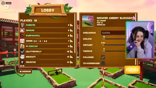 01:01:01Der Spielverlauf ist geprägt von Chaos und Unordnung. Die Spieler sind in einer großen Lobby, was zu Verwirrung und parallel lauten Gesprächen führt. Die Streamerin und die anderen Spieler haben Schwierigkeiten, die Golfbahnen zu meistern und verlieren den Ball häufig in Wasser oder werden durch Hindernisse aufgehalten. Die Rangliste zeigt, dass Kitten führend ist, was bei anderen für Frust sorgt, da das Spiel als sehr fordernd empfunden wird.