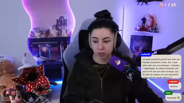 00:32:16Lilly spricht über ihren eigenen Umgang mit sozialen Kontakten. Sie empfindet ihre Streams als ausreichend sozialen Austausch und hat nach dem Stream oft keine Energie mehr für Treffen mit Freunden, da ihre soziale Batterie leer ist. Sie erwähnt ihre Teilnahme an Messen wie der Gamescom und Kaktus und überlegt, ob sie zur TwitchCon in Rotterdam fährt, wobei sie die Organisation kritisiert.