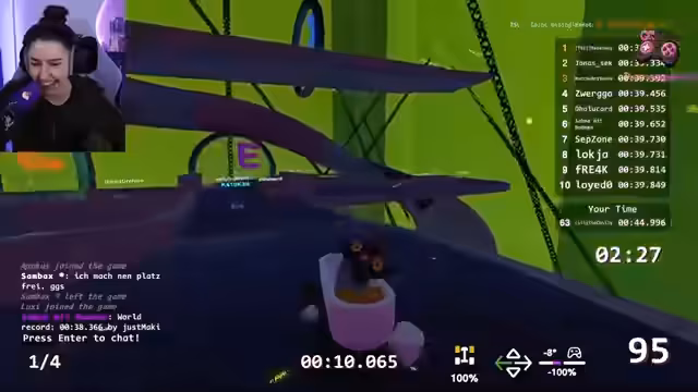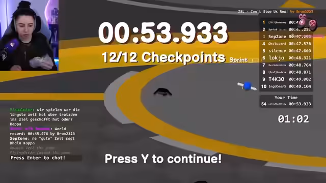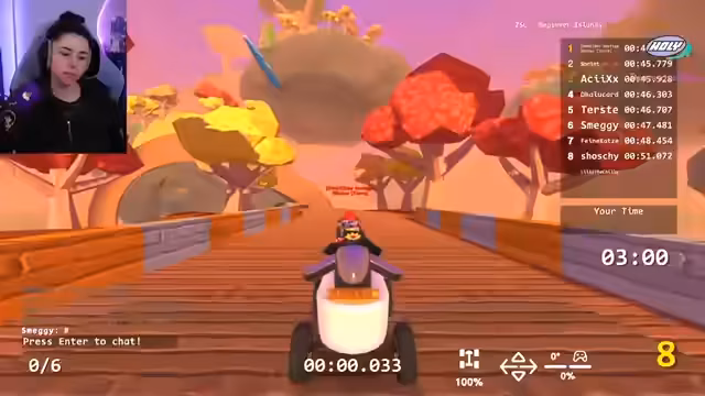 02:03:17Nach anfänglichen Problemen mit den langen Strecken beginnt Lilly wieder mit dem Fahren. Der Fokus liegt darauf, die schwierigsten Abschnitte wie die Glasstrecken und den Looping sauber zu nehmen. Kler findet eine Lösung für eine Strecke und will diese nutzen, während andere Spieler wie Lilly immer noch essen und nicht ins Ziel kommen. Der Chat liefert Anleitungen und Hilfestellungen.