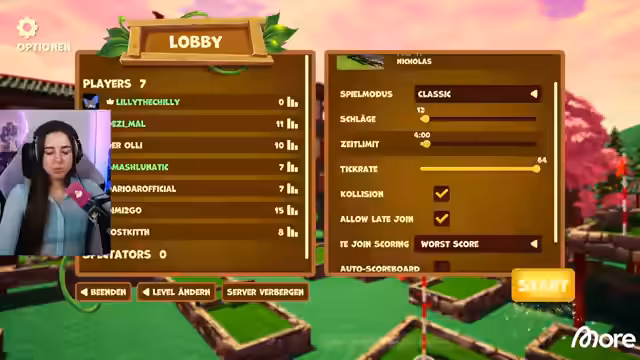 02:51:41Die Streamerin und die Community bereiten sich auf eine gemeinsame Runde Golf It! vor. Es wird ein passwortgeschützter Server mit dem Namen 'Golfen mit Freunden' erstellt. Die Streamerin konfiguriert die Server-Einstellungen, aktiviert Collision und setzt ein Zeitlimit. Nach einigen technischen Schwierigkeiten beim Einladen der Spieler, können alle User schließlich dem Server beitreten und das Spiel beginnt.