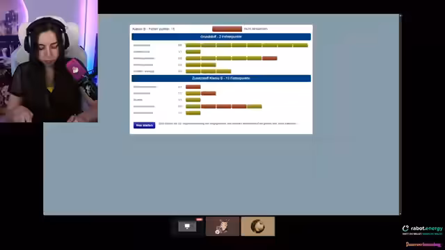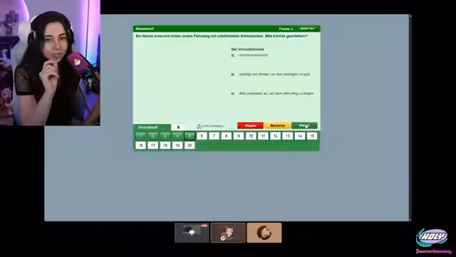 04:25:23Der Stream beginnt mit einem interaktiven Führerschein-Quiz. Lilly und ihr Co-Streamer @smashlunatic beantworten verschiedene Verkehrsfragen, die von der Community im Chat gestellt werden. Die Themen reichen von Verhalten an Vorfahrtstraßen und der Bedeutung von Verkehrszeichen bis hin zur Fahrzeugkontrolle und Unfallverhalten. Die Streamer diskutieren die Fragen oft humorvoll und sind sich bei manchen Themen, wie der zulässigen Anhängelast, unsicher, bevor sie die Lösung finden und sich über ihre Leistungen lustig machen.