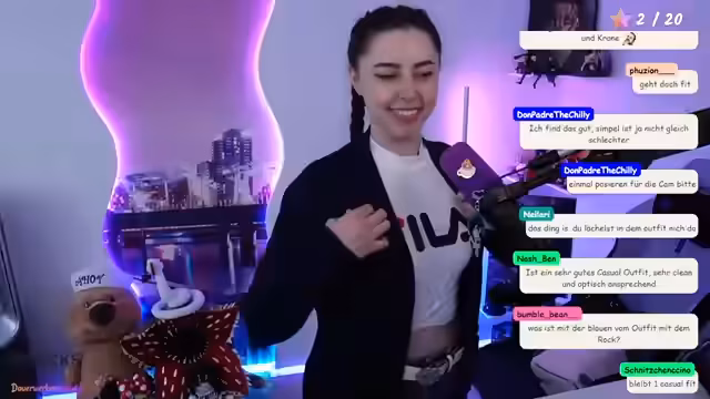 01:20:01Die Streamerin ist bei der Auswahl eines Outfits für einen Messeauftritt unsicher und bittet die Community um Hilfe. Sie probiert verschiedene Kombinationen aus Westen, T-Shirts und Rucksäcken, wobei sie besonders auf Farbabstimmung und Passform achtet. Die Community gibt wertvolle Tipps und Bewertungen zu den verschiedenen Outfit-Varianten, wobei die Weste kritisiert und das erste Outfit favorisiert wird. Die Streamerin zeigt sich dankbar für die und entscheidet sich vorerst für das erste Outfit.