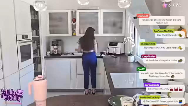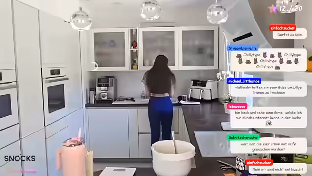 01:21:43Nachdem die technischen Hürden, zumindest teilweise, überwunden sind, betritt die Streamerin endgültig die Küche. Sie stellt das Handy als Kamera auf und beginnt, die Zutaten für den saftigen Schokoladenkuchen vorzubereiten. Dabei unterhält sie sich mit den Zuschauern über das Rezept und ihre eigene Zerstreutheit. Währenddessen bemerkt sie, dass der Kühler für das Handy wichtig ist, um ein Überhitzen zu verhindern, und bereitet sich auf die eigentliche Backaktion vor, während die Bild- und Tonqualität weiterhin getestet wird.