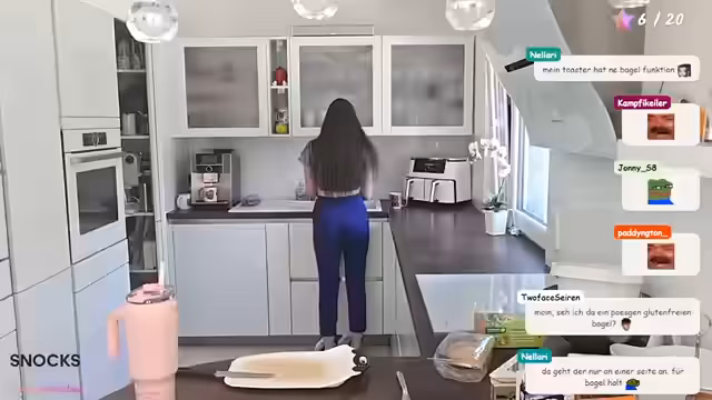 01:39:21Die Zubereitung der Bagels gestaltet sich für die Streamerin nicht ohne Herausforderungen. Sie nutzt zunächst den Toaster mit der Bagel-Funktion, um das Brot aufzubacken. Beim Belegen mit Frischkäse, Butter, veganem Schinken und Gurke bereitet sie sich ein Spiegelei zu. Hierbei macht sie einige Fehler: Sie bringt eine Schale in die Pfanne, was zu Stress und mehrmaligem Händewaschen führt, und stellt fest, dass das Eigelb nicht so geworden ist, wie sie es sich vorgestellt hatte, was sie als eklig empfindet.
