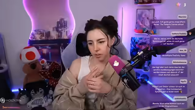 02:13:47Ein zentrales Thema ist die Ambivalenz gegenüber der deutschen Synchronisation. Die Streamerin äußert ihre Vorliebe für den Originalton und beschreibt, wie sie sich oft von der deutschen Synchronisierung abgestoßen fühlt, insbesondere aufgrund von Abweichungen zwischen Mundbewegung und Dialog sowie unpassender Betonungen. Diskutiert wird auch, warum viele Menschen die deutsche Synchronisation bevorzugen, während andere den Originalton als authentischer empfinden. Der Stream betont, dass es eine persönliche Präferenzfrage sei und es nicht um Hetze gegenüber den gegenteiligen Ansichten gehen solle.