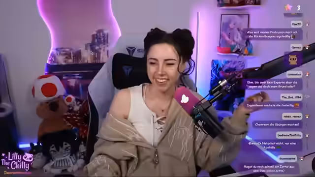 02:22:41Gesprächsthemen wechseln von persönlichen Gesundheitsproblemen, wie Muskelkater und Verspannungen, zu humorvollen Abschweifungen. Streamerin Lilly erwähnt, dass sie Physiotherapieübungen nicht macht und KI oft als hilfreicher empfindet als Ärzte. Der Chat interagiert mit Smalltalk, humorvollen Anspielungen und Spielen, bei denen Fragen auf Zetteln gezogen und beantwortet werden.